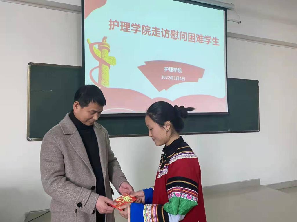 护理学院院长熊杰平亲切地与学生拉家常,详细了解学生复习考试情况及家庭情况,勉励学生要勤奋努力,刻苦学习,鼓励她坚定理想信念,勇于战胜暂时的困难,以优异的成绩回报家庭、回馈母校、回馈社会。受慰问的少数民族同学非常感谢学校和老师们的关心帮助,她表示将不辜负学校和老师们的期望,自强自立,刻苦学习,以积极乐观的心态完成学业,回报母校,回馈社会。