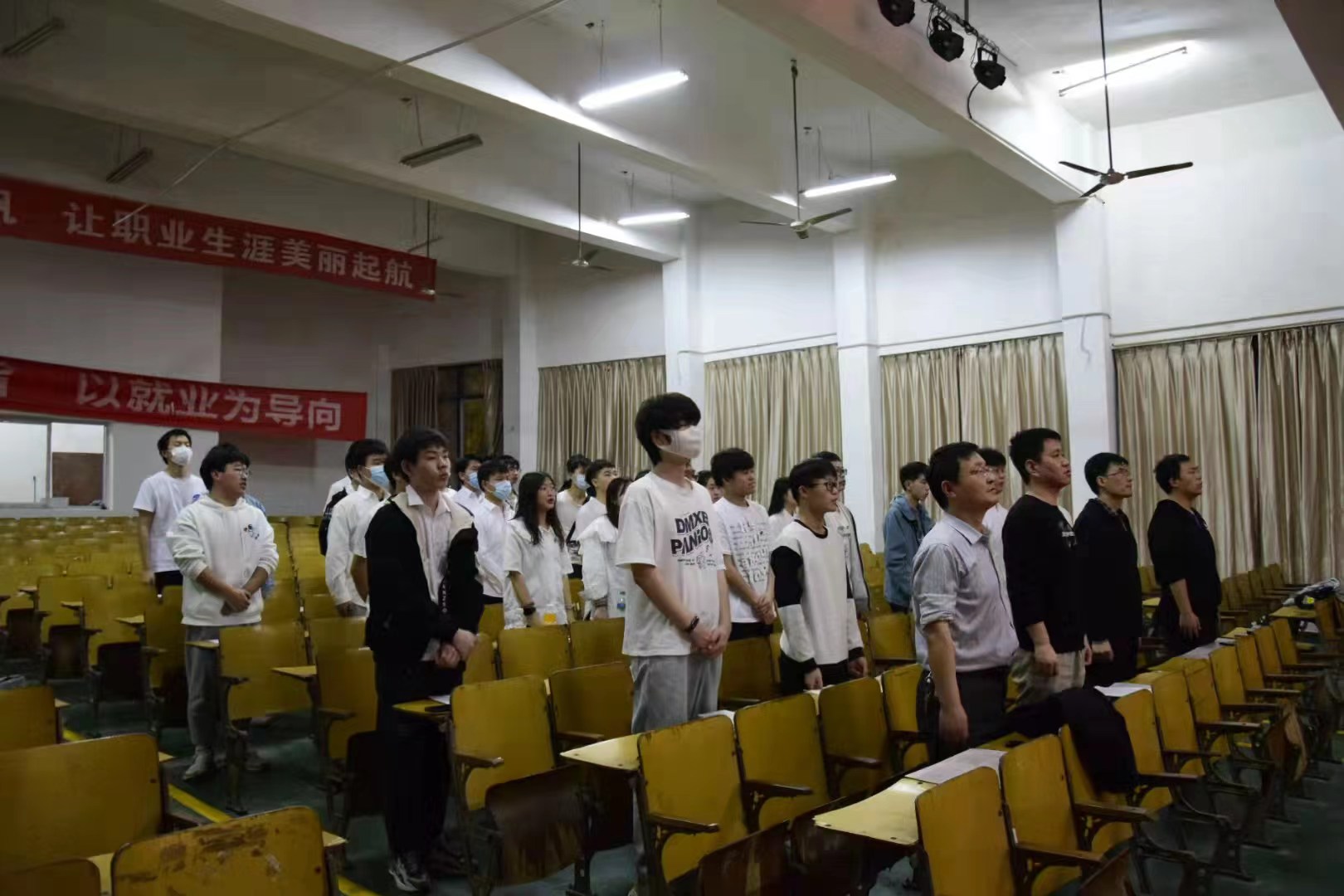 开班典礼前我院本部青马班所有学员和老师在综合科技楼前进行合影留念,随后到老科技综合楼阶梯教室举行开班典礼,新校区学员通过会议直播的方式同时参与。首先,主持人周勤对参与本次青马班筹备工作的老师同学进行感谢并宣布青马班正式开班。会议第一项全体人员起立合唱国歌;会议第二项介绍出席开班典礼的院领导及老师;第三项议程由院学生会主席彭思文宣读本次青马班培训的纪律和考核办法;第四项议程由学员代表王宇浩进行发言;第五项议程是我院党总支书记赵琰进行精彩致辞;最后全体学员起立合唱团歌。开学典礼后,赵琰书记为大家进行本次青马班第一次授课,他的授课主题是“以梦为马 不负韶华”。