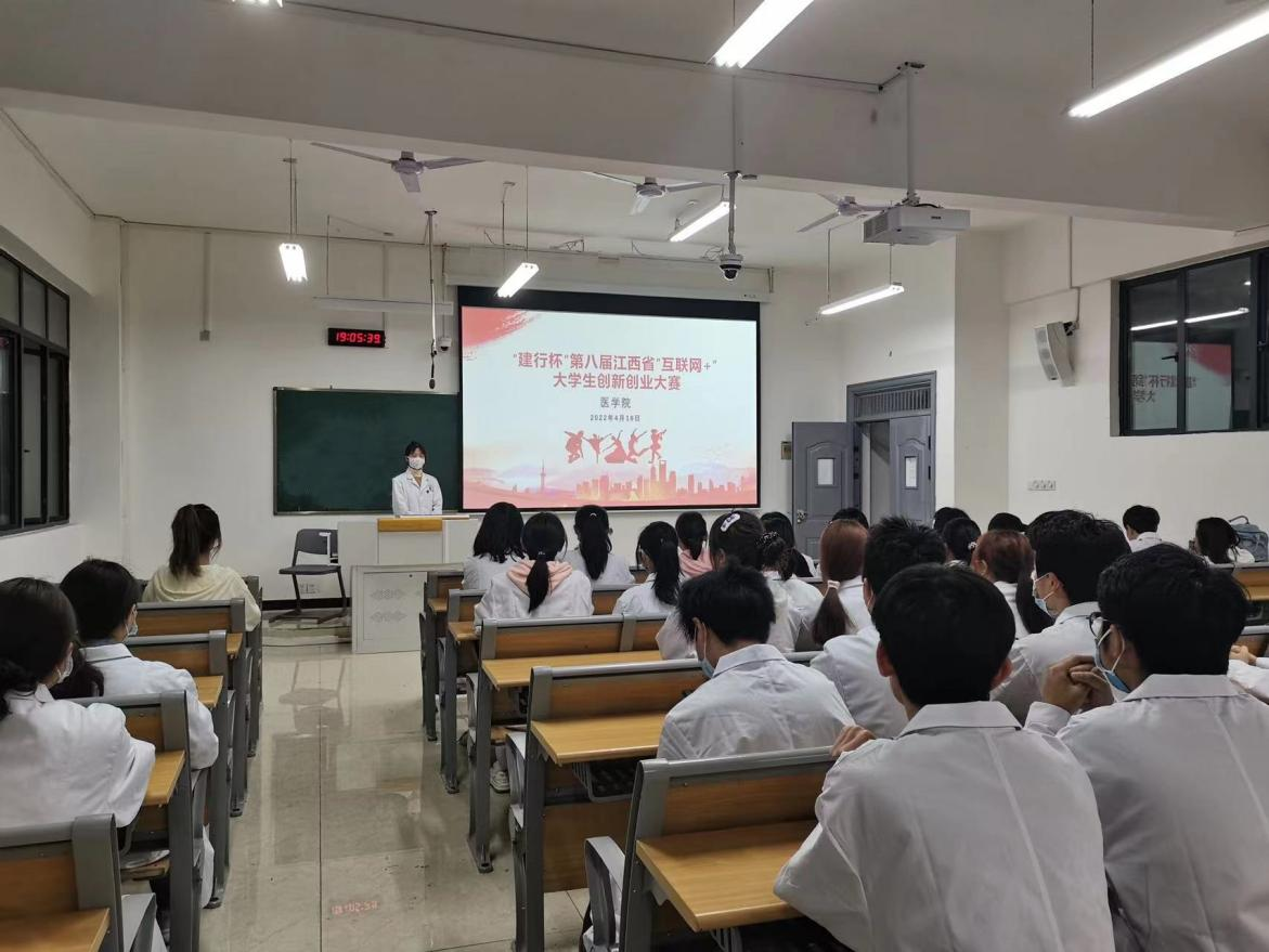 本站讯(医学院 刘清珍)2022年4月19日晚上7:00,医学院在新校区和济楼318教室组织开展了 “建行杯” 第八届“互联网+”大学生创新创业大赛。本届创新创业大赛的参赛人员为医学院20级、21级的同学们,比赛以小班创业为特色,由各参赛人员团队协作、集思广益,创造了12个各具特色的创新创业项目。