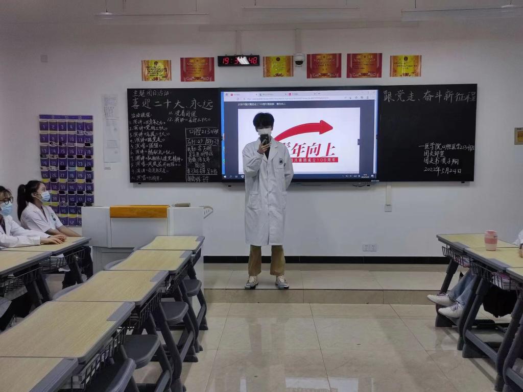 活动中,口腔医学21301班胡春林通过介绍二十大代表选举工作的严谨,让大家感受到举办二十大的重大意义;口腔21302班谢爱权向全班同学讲述赵一曼的铁血故事,让同学们进一步体会革命先烈永不放弃、不惧艰难困苦的精神;影像技术21301班白玛宗吉、陈道红两位同学带领团员紧握右拳,重温入团誓词,进一步坚定“高举团旗跟党走”的信念。