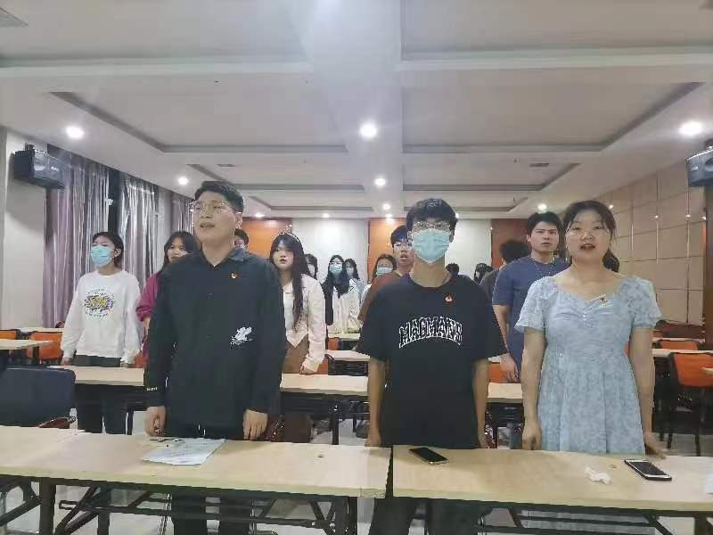 伴随着歌声的响起,全体成员起立一起奏唱国歌,主持人宣布新团员名单:舒紫娟、蒋建宇、揭开阳、付晨曦、张堂力,并特此强调团员意味着责任。青年兴则国家兴,青年强则国家强,中国的新青年在共青团的带领下持续成长,持续进步。随后,给新团员佩戴团徽,发放团员证、团章,并由院学生会执行主席周景荣带领新团员宣誓;入团介绍人康鹏代表宣读《团员的义务和权利》。