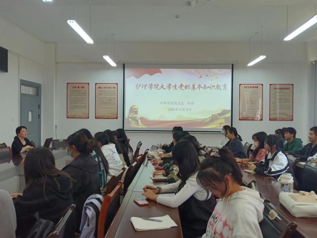 本站讯(护理学院 詹佳颖 钟舒淇)为进一步突出党的政治建设,落实立德树人根本任务,深化大学生理想信念教育,10月21日,护理学院党总支书记胡蓉在和济楼C218开展“永远跟党走 奋进新时代”入党启蒙专题党课活动。参会对象有2022级新生、学生党员(包括预备党员)、发展对象及入党积极分子。