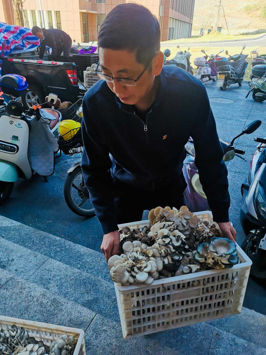 10月21日上午,支部党员同志、后勤产业处其他工作人员与西塘村委干部一起将一箱箱清晨刚采摘下来的新鲜平菇从货车上卸下来称重计量,本次学校食堂购买近500斤新鲜平菇,村集体收入增收1741.5元。