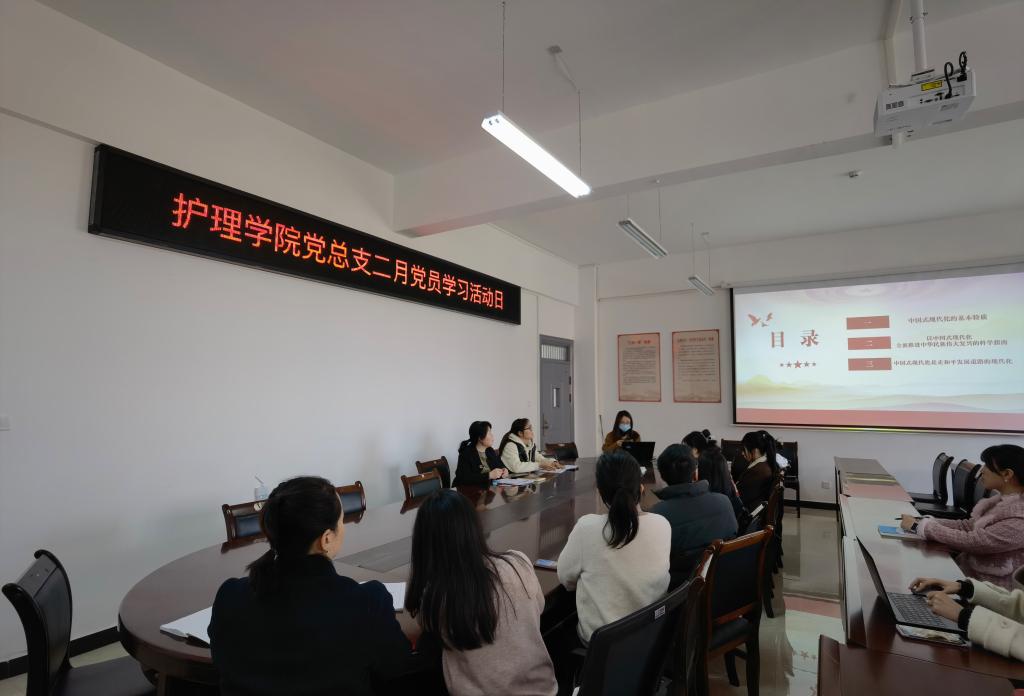 本站讯 (护理学院 周玥)为深入学习贯彻党的二十大精神,全面落实学校“三比三争”工作动员会议部署,近日,护理学院党总支在和济楼C218党员活动室开展二月党员学习活动日活动。活动由院党总支书记胡蓉主持,全体教师党员及在校学生党员参加。