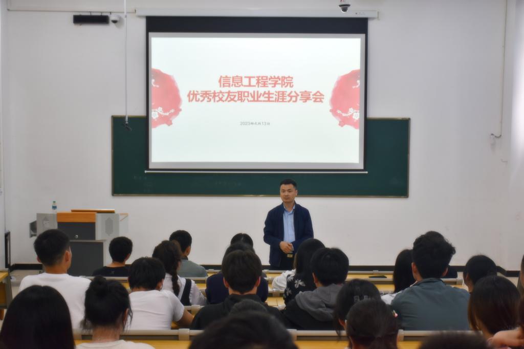 本站讯(信息工程学院 黄彪 刘嘉妮)为帮助同学们更多更广地了解职业世界,坚定人生目标和方向,做好学业、职业和人生规划,4月13日下午,信息工程学院在智云楼B102举办优秀校友职业生涯分享会,活动邀请到优秀校友代表罗健豪为学生分享职业生涯经历,院党总支书记罗来曦,院长简靖韡,各班学生代表出席此次活动。