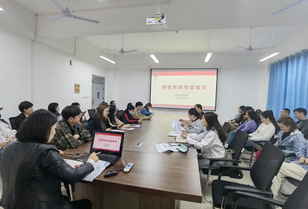 本站讯(艺术与设计学院 曹斐)为进一步提升教师思想政治素质和师德水平,对照学校“春风宜人”师德品牌建设活动要求,4月11日,艺术与设计学院在博达楼A413会议室开展师德师风专题教育活动,活动由院长黄卉主持,全体教职工参加。