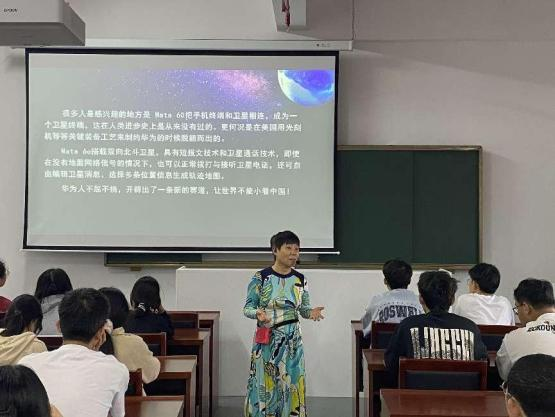 徐娟教授从北斗卫星导航系统的简介、建设缘由、建设原则、工作原理和建设步骤等五个方面进行科普。首先,徐老师放了一段华为Mate 60手机发布会的短视频,以提问的方式与同学们一起探讨Mate 60中的一项人类进步史上从来没有过的新技术——搭载双向北斗卫星,引入本次讲座的主题。整个讲座以视频播放和讲解相结合,从介绍北斗卫星导航系统标识的组成要素开始,通过具体的事例让同学们了解建设的缘由及建设原则,运用高中物理、数学知识讲解工作原理,用生动的语言叙述“三步走”建设步骤背后的故事,让同学们知道中国北斗是怎样冲破层层封锁、攻克多项卡脖子关键技术而最终建设成功。最后,徐老师以“中国人凭中国智慧,中国力量,提出中国方案,开辟出一条条新的赛道,去引领世界未来的发展”做结束语,讲座在浓浓的爱国气氛和热烈的掌声中结束。