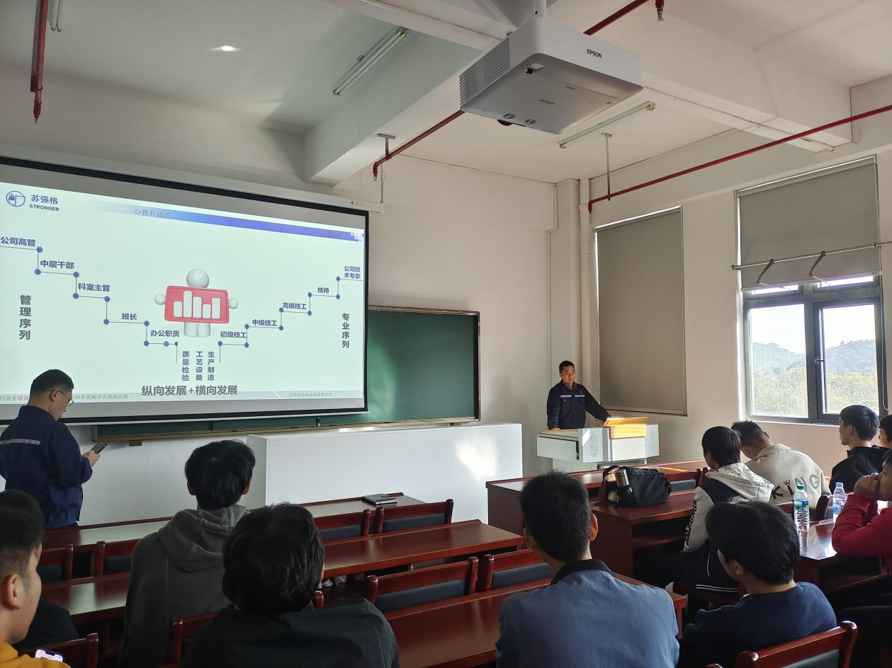 本站讯(机电与新能源汽车学院 彭卫发)为进一步做好实习生就业工作,抢抓毕业生就业黄金期,引导学院2024届毕业生高质量就业,11月21日,机电与新能源汽车学院邀请江西苏强格液压有限公司在新能源技术工程中心601教室开展专场招聘宣讲会。