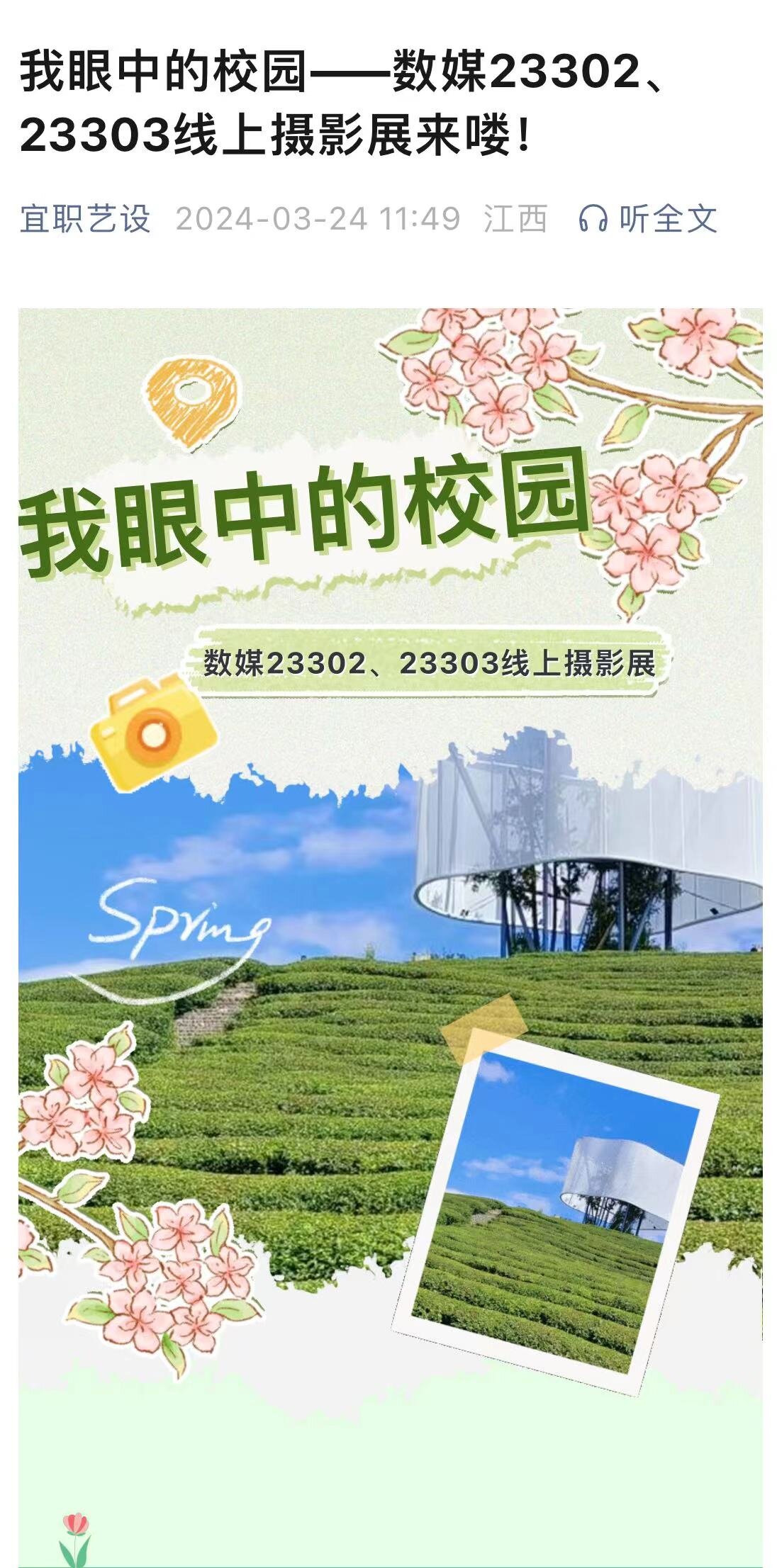 本站讯 (学生记者 聂君颖)为记录春日美景,展示同学们的专业技能,扩展其艺术视野,丰富其课余生活,激发同学们对校园的热爱,3月24日,艺术与设计学院数媒设计专业23302 、23303班举行线上摄影展。