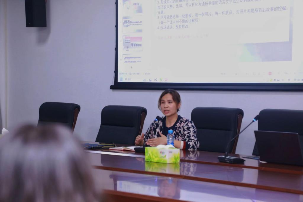 培训中,孙平围绕讲解准备、讲解接待和讲解结束三方面,结合具体案例,生动形象地阐述了讲解员应做好的各项准备工作,并就举止礼仪、语言表情与临场应变等方面分享经验和见解。孙平表示,要从一名背诵式的讲解员成长为一名专家式讲解员,须在每一块展板、每一张照片、每一件展品上……下功夫,挖掘其背后的故事,蕴藏的文化,形成自己的讲解风格,才能为观众带来更加丰富和深刻的体验。
