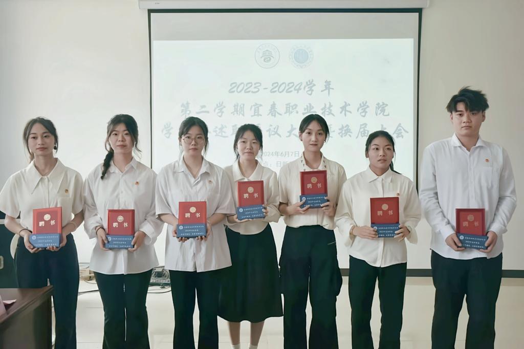 校学生会主席团成员郝海萍宣读了2024年校学生会实习部长、副部长通过名单;紧接着,校学生会主席团成员邹美娜宣读2024年退任学生会工作人员名单;随后,由校团委老师为退任人员颁发聘书并合照留念。