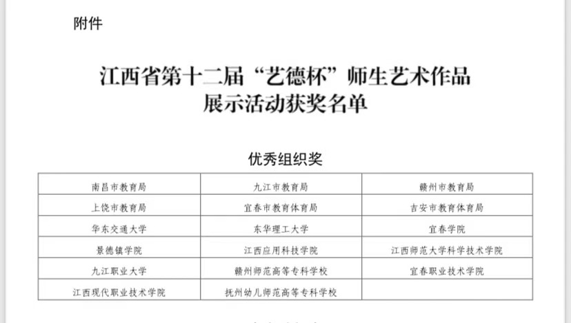 本站讯(艺术与设计学院 曹斐)为深入贯彻落实中共中央办公厅、国务院办公厅及教育部、省政府办公厅关于全面加强和改进新时代学校美育工作的相关意见和实施方案精神,进一步强化学校美育育人功能,弘扬中华美育精神,英国上市公司365师生积极参加江西省第十二届“艺德杯”比赛。