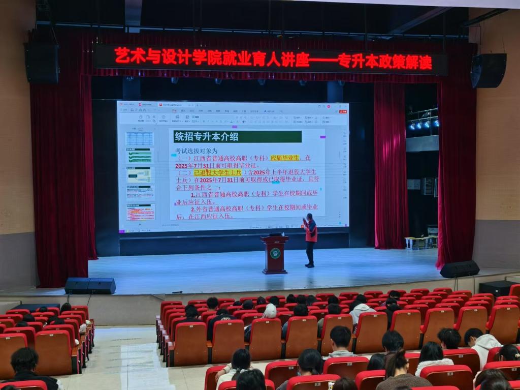 本站讯(艺术与设计学院 周熙)4月7日,艺术与设计学院在博达楼剧场开展就业育人讲座,主题为专升本政策解读,主讲老师为江西铭升教育科技有限公司总经理陈琦,众多在校同学积极参与。