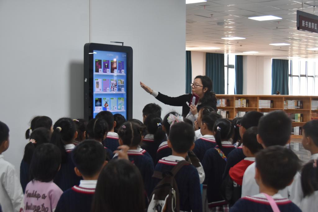 随后,工作人员分组带领幼儿参观图书馆,讲解图书分类和借阅规则。孩子们好奇地观察数字化阅读设备,直观感受传统纸质书与现代科技的融合之美。参观中,孩子们轻声交流、眼神中满是好奇。