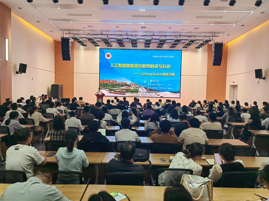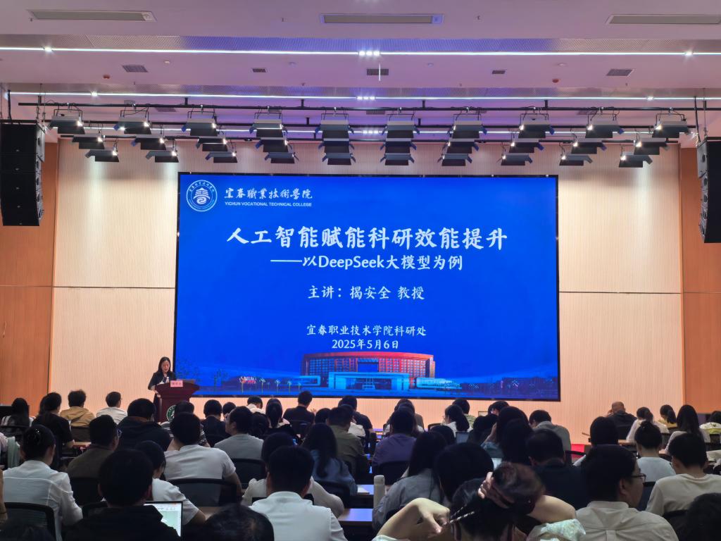 本站讯(科研处 谢巍)5月6日下午,科研处在天工楼四楼学术报告厅举办《人工智能赋能科研效能提升——以DeepSeek大模型为例》专题讲座,特邀江西师范大学教育教学评估中心主任揭安全教授担任主讲。讲座由科研处处长彭慧洁主持,全校各院部190余名教师代表到场聆听。