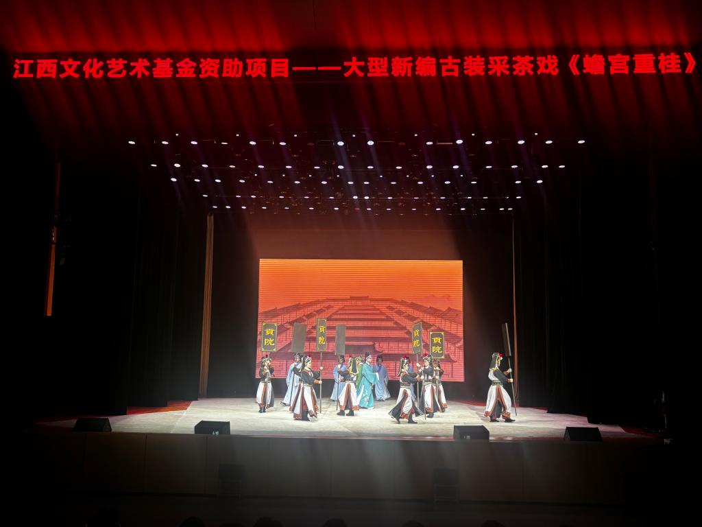 《蟾宫重桂》以唐武宗会昌五年的科举故事为蓝本,讲述了袁州府举子易重历经两次考试,最终夺得状元、洗清朝堂冤屈的传奇故事。作为中国科举史上唯一的重试案例,这一题材本身极具历史厚重感。该剧在坚守采茶戏传统唱腔与表演程式的基础上,融入现代舞美设计与叙事节奏。演员们细腻的身段、婉转的唱腔,搭配精良的服装道具,将唐朝的社会风貌与人物的家国情怀展现得淋漓尽致,让师生直观感受到江西地方戏曲的蓬勃生机。