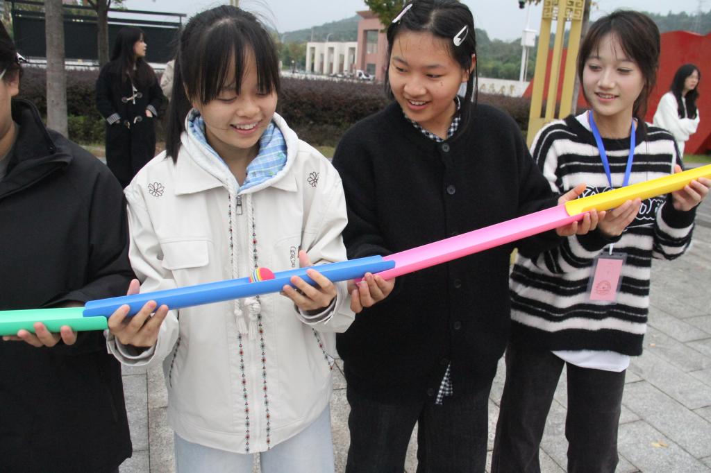 本次活动设置“不倒森林”“一圈到底”“珠行万里”“同心击鼓”等九个集体项目。在“珠行万里” 比赛中,队员们通过U型槽依次传递小球,动作衔接无缝,尽显团队协作的流畅与默契;“同心击鼓”项目中,全体队员紧握绳索、凝心聚力,整齐划一地操控鼓面颠球计数;个人跳绳项目中,参赛选手身手矫健、绳影翻飞,尽显利落身姿;篮球定点投篮现场,队员们凝神静气,精准投掷,将现场气氛推向高潮。各场地加油声、欢呼声此起彼伏,展现出青年学子团结进取、朝气蓬勃的精神风貌。