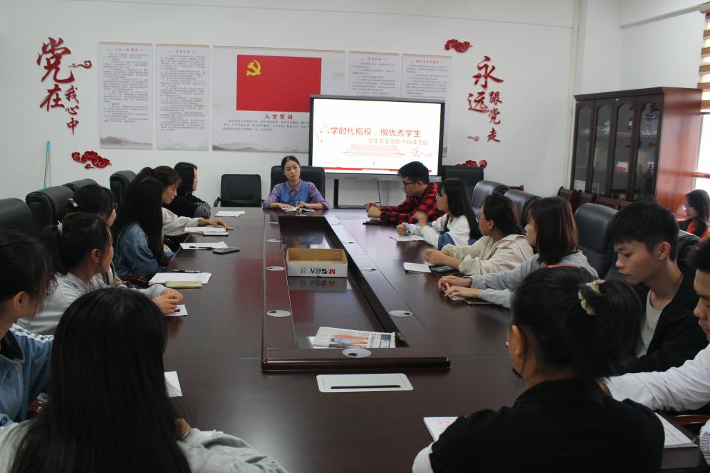 本站讯(国际教育学院 周沫利 学生记者 欧阳怀玉)为提高我院学生的思想道德素质,在我院营造知荣辱、争优秀的良好风气,国际教育学院学生工作党支部于9月25日下午在科技综合楼开展以“学时代楷模,做优秀学生”为主题的支部挂点活动。此次活动由我院学生工作支部党员周沫利主持开展,共计29位入党积极分子和各班优秀团员代表参与此次活动。