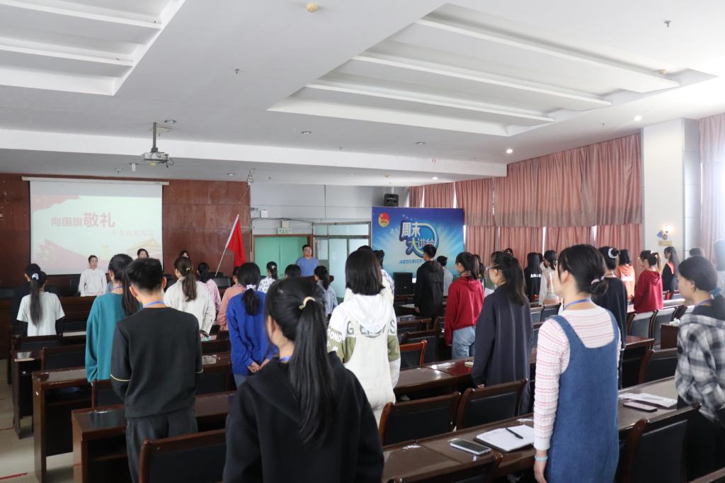 本站讯(团委 梅应轩 学生记者 彭洋)为庆祝新中国成立71周年,加强青年学子爱国主义思想教育,9月29日中午,校团委在第一教学楼九楼报告厅开展“向国旗敬礼——青春致敬祖国”主题团日活动。校团委书记施旸、副书记杨雨,团委老师雷斯羽出席本次活动,校学生会部分成员及校广播站全体成员共100余人参与活动。