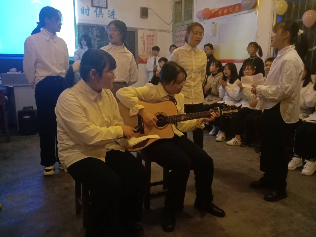 同学们紧扣主题,以歌曲演唱、舞蹈串烧、小品表演等形式开展活动。活动中,班主任老师来到现场观赏节目,全班同学一同送上温暖的祝福,老师也对同学们的祝福表示感谢。