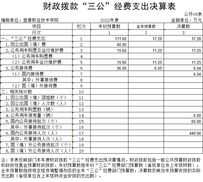 (六)“三公”经费:因公出国(境)费用反映单位公务出国(境)的国际旅费、国外城市间的交通费、住宿费、伙食费、培训费、公杂费等支出;公务接待费反映单位按规定开支的各类公务接待(含外宾接待)费用;公务用车运行维护费反映单位按规定保留的公务用车租用费、燃料费、维修费、过桥过路费、保险费、安全奖励费用等支出;公务用车购置反映单位公务用车车辆购置支出(含车辆购置税)