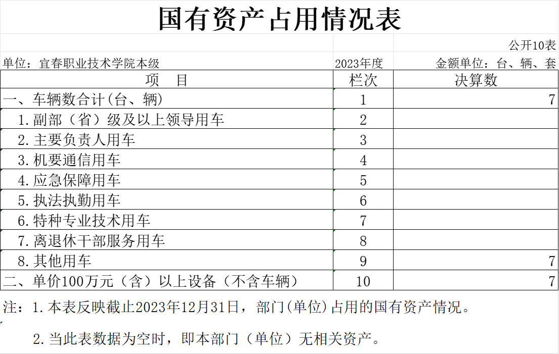 截止2023年12月31日,本单位共有车辆7辆(台),其中:副部(省)级及以上领导用车0辆、主要负责人用车0辆、机要通信用车0辆、应急保障用车0辆、执法执勤用车0辆、特种专业技术用车0辆、离退休干部服务用车0辆、其他用车7辆,其他用车主要是用于教学运行中公务出差学习。本单位单价100万元(含)以上设备(不含车辆)7台(套)。