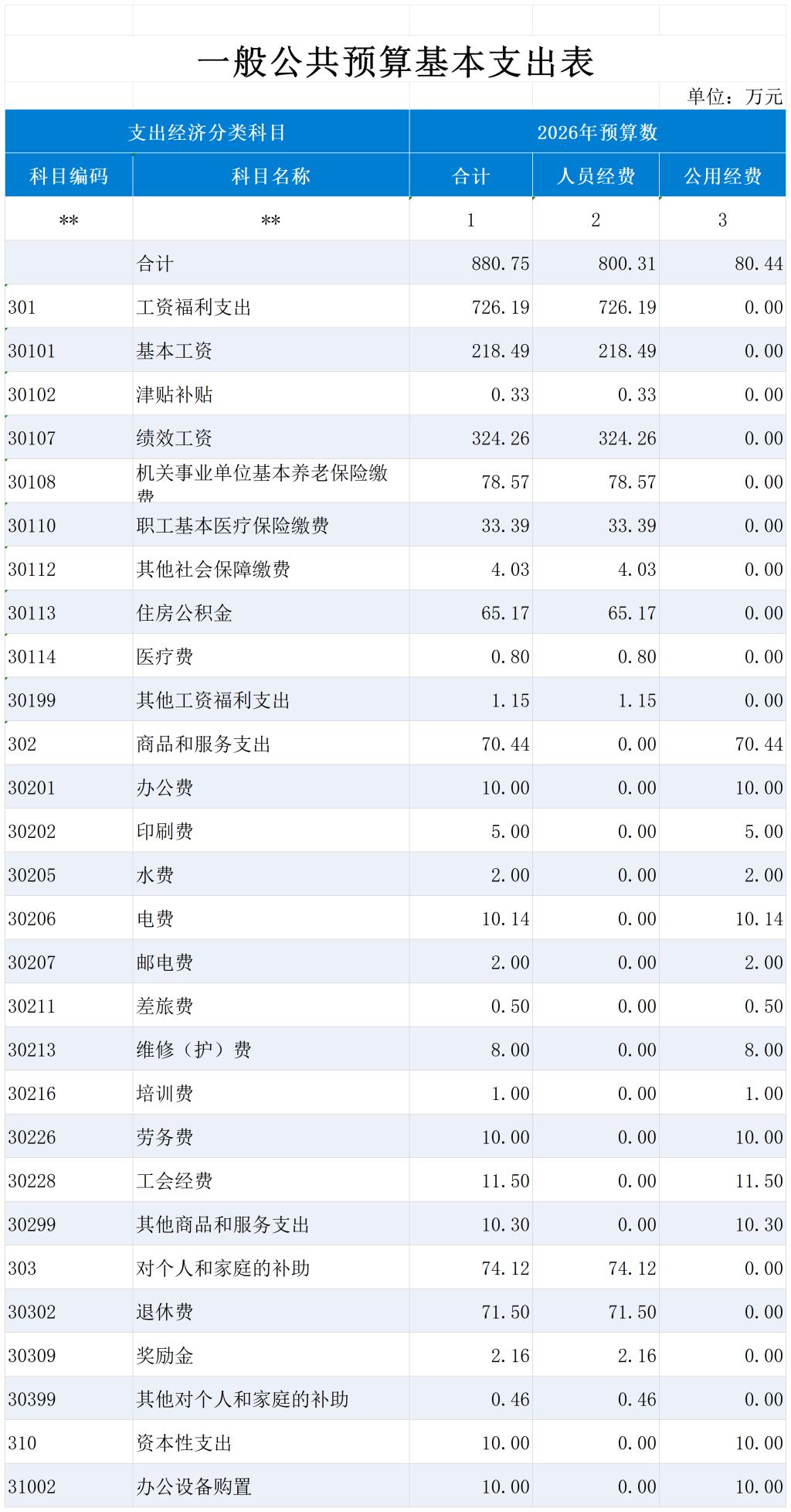 按支出项目类别划分:基本支出880.75万元,较上年预算安排增加91.55万元;其中:工资福利支出726.19万元,商品和服务支出70.44万元,对个人和家庭的补助74.12万元,资本性支出10万元。项目支出11万元,较上年预算安排无增减变化;其中:商品和服务支出11万元。