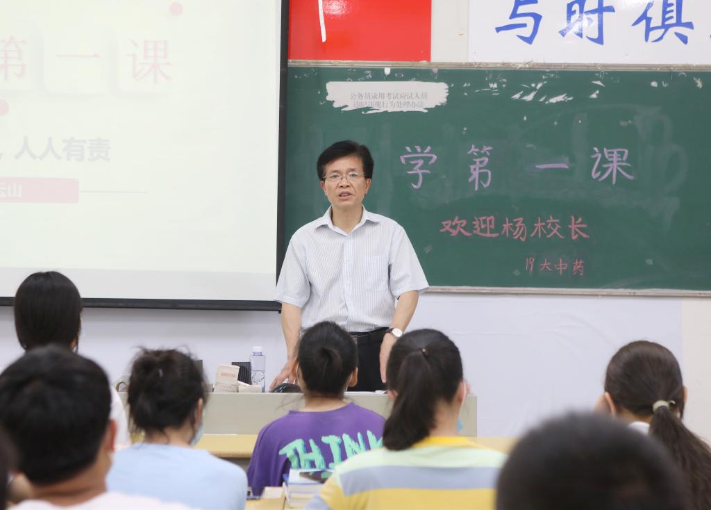 校党委副书记、校长杨云山为19大中药班的同学们讲授了“第一课”。杨云山通过互动交流,了解了同学们的返校情况、在家学习生活情况;讲述了钟南山院士、李兰娟院士及援鄂医务人员的义举,号召同学们珍惜韶华、学好本领;介绍了学校疫情防控工作整体情况,要求同学们从我做起、从细微之处做起,积极配合疫情防控工作,投入到新的线下学习中去。
