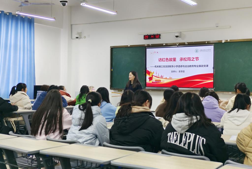 本站讯(机关第三党支部 宋彩虹)为深化理论学习、凝聚思想共识,更好学习宣传党的二十大精神,推进支部“双联系三结对”工作,12月9日上午,机关第三党支部书记彭慧洁在正心楼B310以《访红色故里 承松筠之节》为题,联系小学道德与法治教育专业班级讲授廉政党课。