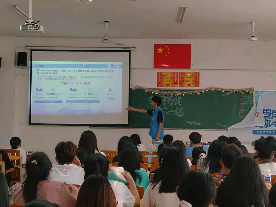 随后,宣讲人程艳飞从发展核电的紧迫性、优越性及主动性三个方面概述了如何助力碳中和目标的实现。接下来的提问环节,让气氛快速活跃起来。程艳飞生动有趣的讲述,让学生们了解到“核”知识,并进一步提高了对核电发展的认知。