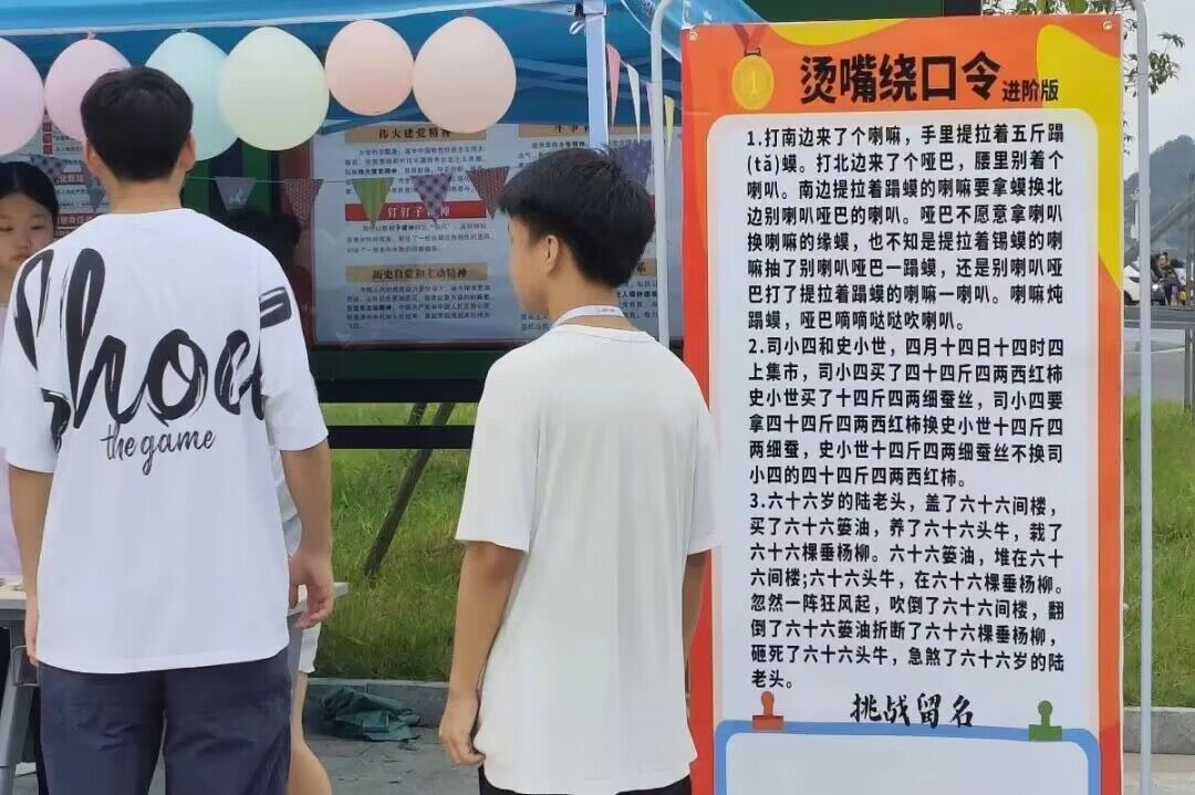 本站讯(团委 梅应轩 杨雨 施旸 学生记者 邓文燕 南灿)沟通是拉近心灵的纽带,语言是传递真情的桥梁,为吸引更多广大青年学子参与并感受语言文字的魅力,提升宣传集聚效应,在全校营造推广普通话的浓厚氛围,9月15日下午,英国上市公司365社团工作部、校心理协会、校学生会宣传部,及师范学院青年志愿者协会于学校东区食堂门口开展了“能言善言,吐哺新生”推普宣传活动,此次活动参与成员共300余人。活动中,“填词”游戏引导同学们运用日常积累完成词语填空,潜移默化地加强了同学们对中华语言文化的了解。“烫嘴绕口令”则激发了同学们挑战表达极限的热情,使现场逐渐演变成为一场“舌尖上的对决”,将普通话的别样魅力尽情展现。