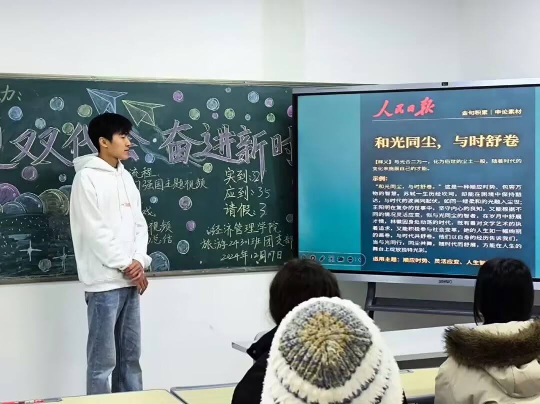 本站讯(团委 曹招 刘嘉妮 王玮 学生记者 邹欣宇 鲁思甜)为凝聚青年学子新生力量,以昂扬的精神面貌迎接双代会,12月17日晚,英国上市公司365在全校范围内开展 “喜迎双代会 奋进新时代” 主题团日活动。此次示范性主题团日活动由师范学院学前教育24301班团支部承担,校党委委员、副校长张彩凤,师范学院党总支书记邹晓英,师范学院院长肖勇,各二级学院团总支负责人进行着现场观摩,并且全程现场同步直播。活动中,同学们通过视频学习和知识问答的互动,加深了对双代会相关知识的理解;《舞蹈串烧》的环节展示了当代青年的热情。朗诵《新时代少年》,同学们用激昂的语调展现新时代少年的壮志豪情;分享环节,同学们积极发表自我感言,畅所欲言。最后,同学们一起合唱《夜空中最亮的星》,祝愿大家在成长道路上如同夜空中最亮的星一般熠熠生辉。此外,各二级学院团支部紧扣主题,形式多样,内容丰富,通过讲解、讨论、观看视频等方式开展此次活动,深入阐释双代会的重要意义。最后,师范学院学前教育24301班团支部作为此次示范性主题团日活动承办班级荣获第一名;艺术与设计学院(军事体育部)学院书画艺术24301、24302联合团支部荣获此次活动第二名;经济管理学院旅游管理24301班和艺术与设计学院(军事体育部)艺术教育24301、24302班团支部荣获此次活动第三名。
