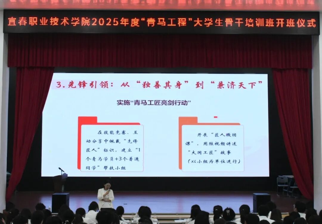 本站讯(团委 张为岷 刘嘉妮 王玮 学生记者 曾雅萱 汤包根)为引导青年学子坚定理想信念,争做当代中国马克思主义的坚定信仰者和践行者,5月27日下午,2025年“青年马克思主义者培养工程”大学生骨干培训班开班仪式于仁济楼小礼堂展开。校党委委员、副校长张彩凤,各二级学院团总支书记及全体青马班学员齐聚一堂,共同开启这场“青春与信仰碰撞”的成长之旅。典礼由团委老师张为岷主持。开班典礼在庄严的国歌声中拉开帷幕。主持人首先介绍出席领导与嘉宾,并向通过层层选拔的学员表示祝贺,现场气氛庄重而热烈。团委老师张为岷详细解读了本次青马班的培训安排及纪律要求,强调培训将通过理论学习、实践锻炼、红色研学等多元形式,系统提升学员的政治素养与综合能力。紧接着,学员代表刘雨轩在发言中分享了对青马班的期待,她的发言引发在场学员的共鸣。副校长张彩凤在开班讲话中对学员提出殷切期望,青年骨干要以“信念坚定”“能力突出”“素质优良”“学风过硬”四个词为核心,努力成长为堪当民族复兴重任的时代新人。她指出,全体学员既要志存高远,又要脚踏实地,为推进学校“双高”建设贡献青春智慧和力量。开班仪式结束后,由张彩凤以“匠心筑梦,赢在未来”为题,为学员解码匠工精神的三大核心:创新突破、精益求精、专注执着。这堂课程,以历史为笔、以实践为墨,为高职青年勾勒出一条“有温度的成长曲线”——不是机械地掌握技能,而是成为“有信仰的技术派、有情怀的实干家”。