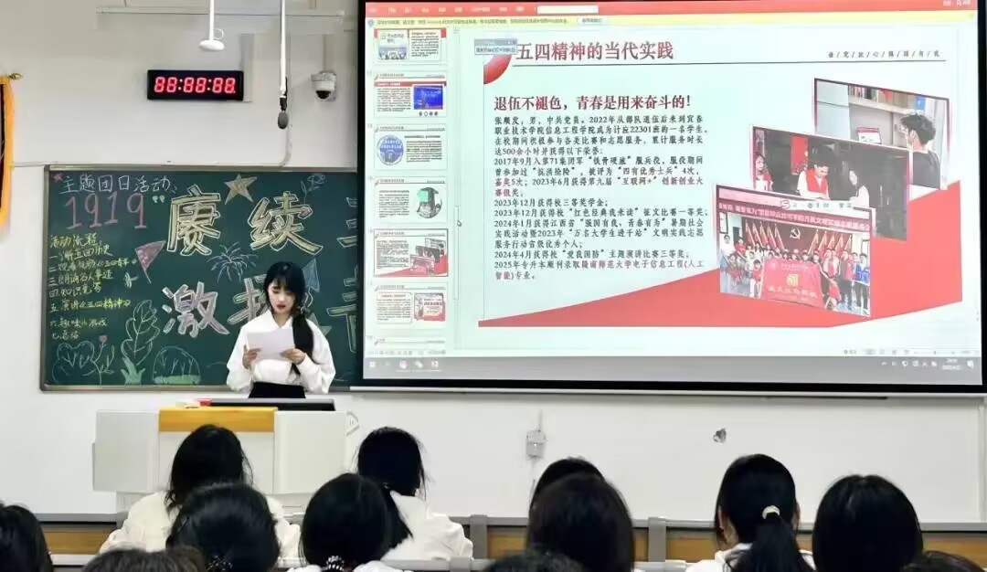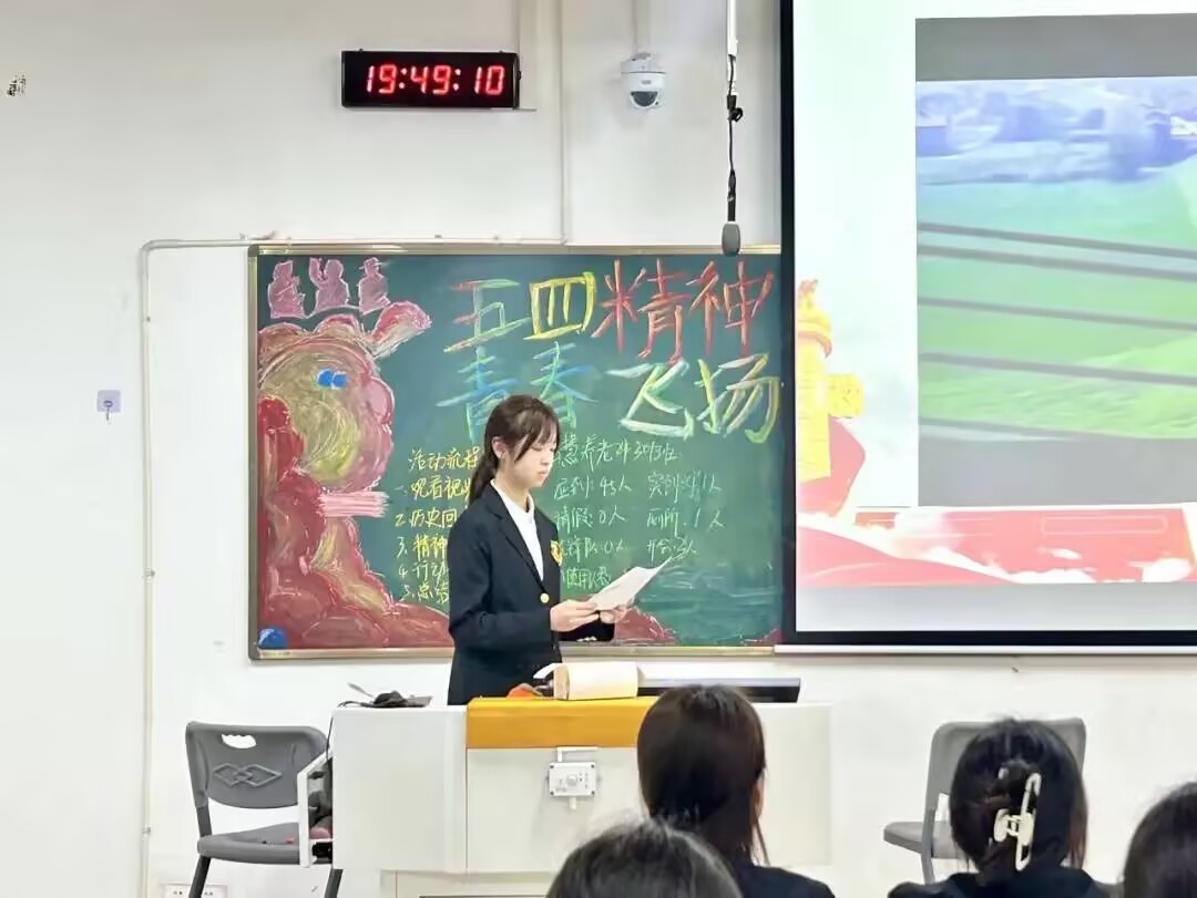 本站讯(团委 张为岷 刘嘉妮 王玮 学生记者 曾雅萱 汤包根)为深化党史教育,弘扬五四精神,激励青年学子勇担时代责任,4月27日晚,校团委在全校范围内组织开展“赓续五四薪火,激扬青春担当”主题团日活动。活动以“五四运动”历程回顾开篇,通过视频重现“外交失败—学生集会—游行示威—三罢斗争—拒签合约”的历史脉络,并结合马克思主义哲学“波浪式前进”理论,剖析运动曲折中的觉醒意义,引导学生从历史逻辑中理解青年奋斗的时代价值。各班级团支书围绕五四青年节起源,系统解读“爱国、进步、民主、科学”四大精神内核。“新时代青年行动纲领”分享环节成为活动高潮。“雨衣妹妹”刘仙逆行武汉抗疫,郭宇航用行动诠释医者仁心;张思媛、雷钰莹、杨飞飞三位青年携手拿下高职组食品药品与粮食赛道二的赛项冠军;邱良清勇敢扎根贫困地区支教;刘浩仪用时间书写自己的追梦道路,吴丹梦以职教扶贫书写自强不息的青春答卷;张颂发在青春的道路上从未懈怠,他的底色是奋斗,杨梦娇以歌声唱响她的专属风采,她的底色是灿烂。以上八位同学的光辉事迹,如火炬般点燃学弟学妹们对标榜样的热忱,让五四精神的光芒在青年心中璀璨闪耀、熠熠生辉。活动最后,各班级联合发起“五个一”倡议:精读一本经典、开展一次宣讲、发起一个创新项目、攻克一个专业难题、参与一次爱心服务。五四精神的当代价值,在于把爱国情怀转化为强国志向与实际行动。