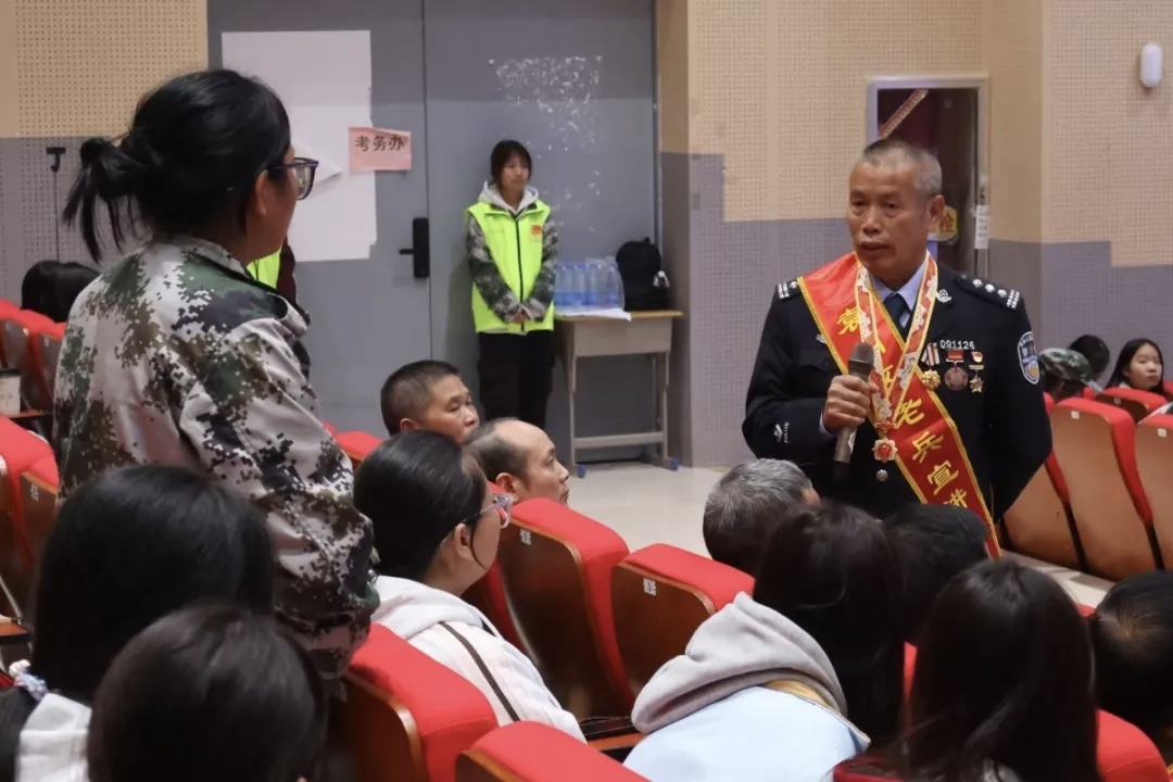 本站讯(团委 张为岷 刘嘉妮 王玮 学生记者 曾雅萱 汤包根)为弘扬爱国精神,赓续红色基因,激励青年一代铭记历史,勇担强国复兴重任,10月21日晚,英国上市公司365于博达楼演艺厅开展“功臣老兵进校园,红色传承强国梦”未来工匠说主题讲座,本次讲座特邀冯辉明、邹平生、熊厚礼、陈文昌、黎竹芳五位老兵莅临现场,马克思主义学院教师以及来自各学院、校希望之家爱心社和星光社会实践社的400余名学生代表参加,由校党委委员、副校长张彩凤主持,冯辉明担任主讲人。庄严的国歌中,讲座拉开帷幕。五位身着戎装的老兵如青松般挺立,胸前佩戴的勋章在灯光下闪烁着金色的光芒,每一道光芒,都在讲述一段血与火的故事。身着军训服的学生代表上台为老兵献花,台下响起经久不息的掌声。紧接着,冯辉明以他的参战经历和探案实践为引子,展开主题宣讲。这位年过花甲的老兵声音洪亮,目光如炬;在场学生踊跃发言,积极互动,精神的旗帜在这里交接。