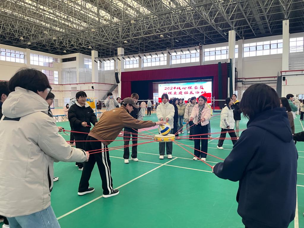 体育馆内,一系列精心设计的心理素质拓展活动逐一展开。同学们个个精神饱满,全情投入。在“投壶”活动中,大家凝神聚力,将箭矢精准地投入壶中,每一次成功命中都引发现场观众的热烈欢呼;“珠行万里”的团队协作中,同学们默契配合,小心翼翼地传递着珠子,紧张与欢笑交织;“公鸡下蛋”的趣味环节,大家蹦蹦跳跳,努力将球从绑在腰后的盒子中抖出,滑稽的动作让人忍俊不禁;“摸石过河”的挑战中,参与者们手脚并用,灵活地踩着“石头”前进,展现了智慧与平衡的完美结合;“同心鼓”的团队合作更是将气氛推向高潮,大家齐心协力,用鼓面弹起球来,每一次成功都伴随着热烈的掌声;“袋鼠跳”的比赛中,同学们套上布袋,奋力跳跃,欢快的节奏和加油声此起彼伏,让整个场地沸腾起来。