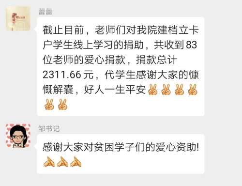 当天,师范学院的其他老师们看到了这则新闻,并得知师范学院还有很多建档立卡户学生后,立即紧随其后,纷纷参与到这项接力中来,以帮助更多的建档立卡户学生在线学习不掉线!