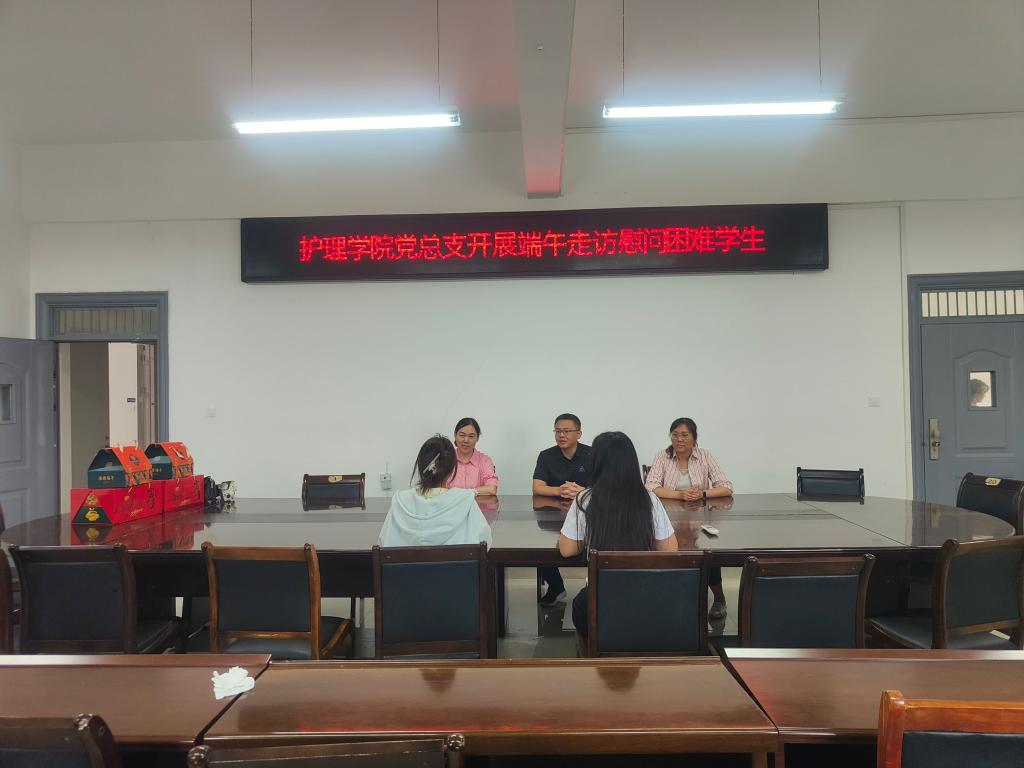 同日,护理学院党总支在和济楼C218开展端午节走访慰问困难学生活动。党委委员、副校长刘叶健,院党总支书记吴少林、副书记曲晴陪同参与。刘叶健与学生亲切交谈,详细询问他们的家庭情况、学习进展和生活需求,认真倾听学生在学业规划、职业发展等方面的困惑,并鼓励学生们:“困难是暂时的,学校始终是你们最坚强的后盾。希望同学们树立信心、勤奋学习,用知识改变命运,用奋斗成就未来。”吴少林重点关注学生心理健康,鼓励其积极参与学院的各项活动,在实践中增强综合能力,树立自立自强信心;受助学生深受感动,表态将珍惜学习机会,努力考取护士资格证及1+X职业技能等级证书,以优异成绩回馈学校关怀,并积极参与志愿服务传递爱心。