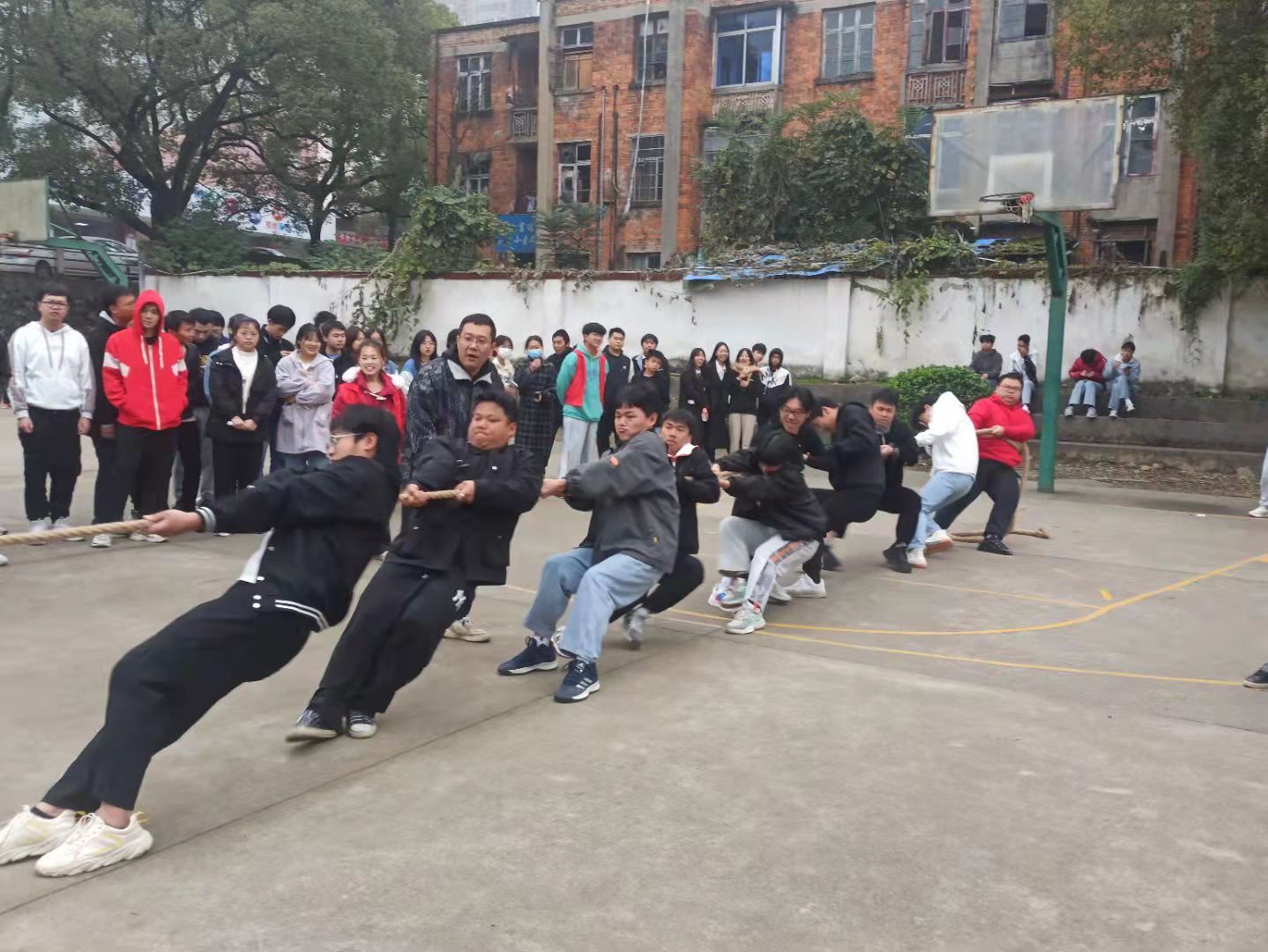 比赛中,每当比赛的哨声一响起,队员们口中一起呼喊着“加油,一二”双手紧握长绳,努力拼搏,无论是场上还是场下,气氛都异常紧张,富有节奏的呐喊声、加油声,充斥在操场上空。尤其是在胜负难分的关键时刻,大家毫不退却,咬紧牙关坚持到底。