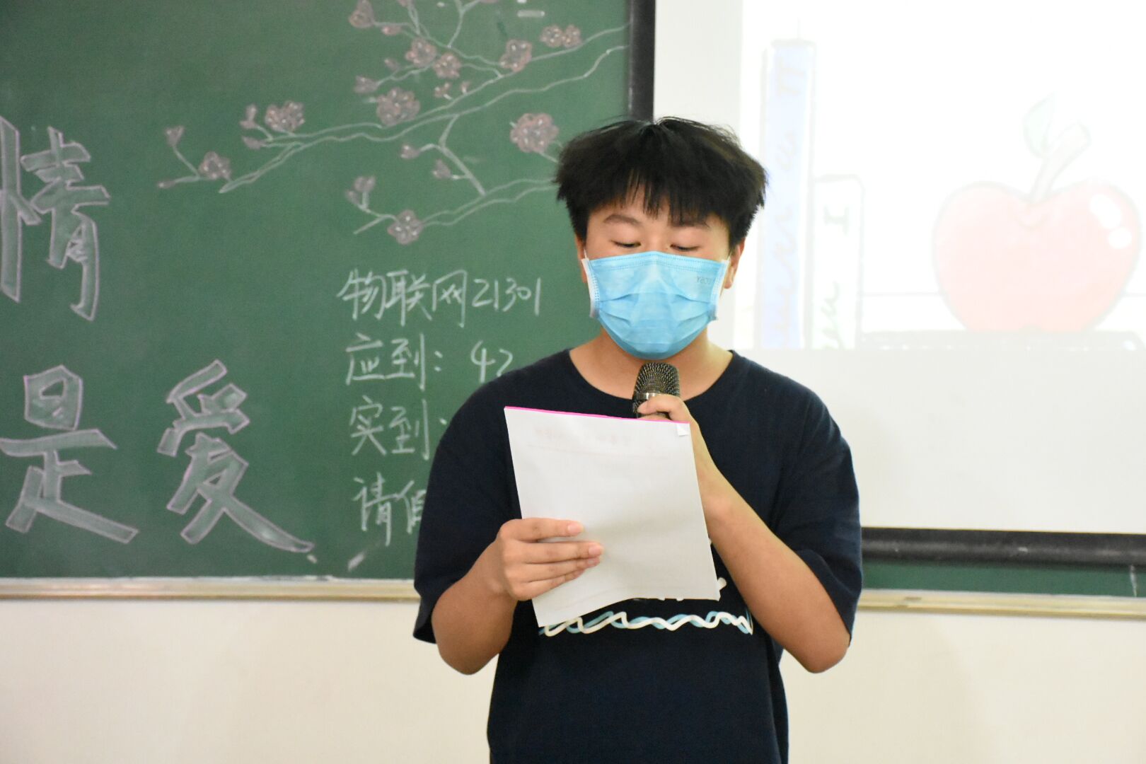 活动伊始,主持人带领大家一起观看老师们的校园防疫工作视频,视频中老师校园忙碌的身影,办公桌前堆积如山的文件要审核等等画面,让在场的师生感受到了老师工作的不易。接着,学生代表发言,感谢老师的同时表示只要老师需要,愿意为老师分忧。随后,四位老师与学生一起做互动猜字游戏,来促进师生感情。最后,全班齐唱《老师你好》并给四位老师献花,整场活动掌声不断、氛围活跃。结束活动后,李兵兵肯定了此次活动从环节到细节紧扣主题,作为老师得到同学们的理解很感动,最后鼓励同学们珍惜在校时光,成长为更好的自己。