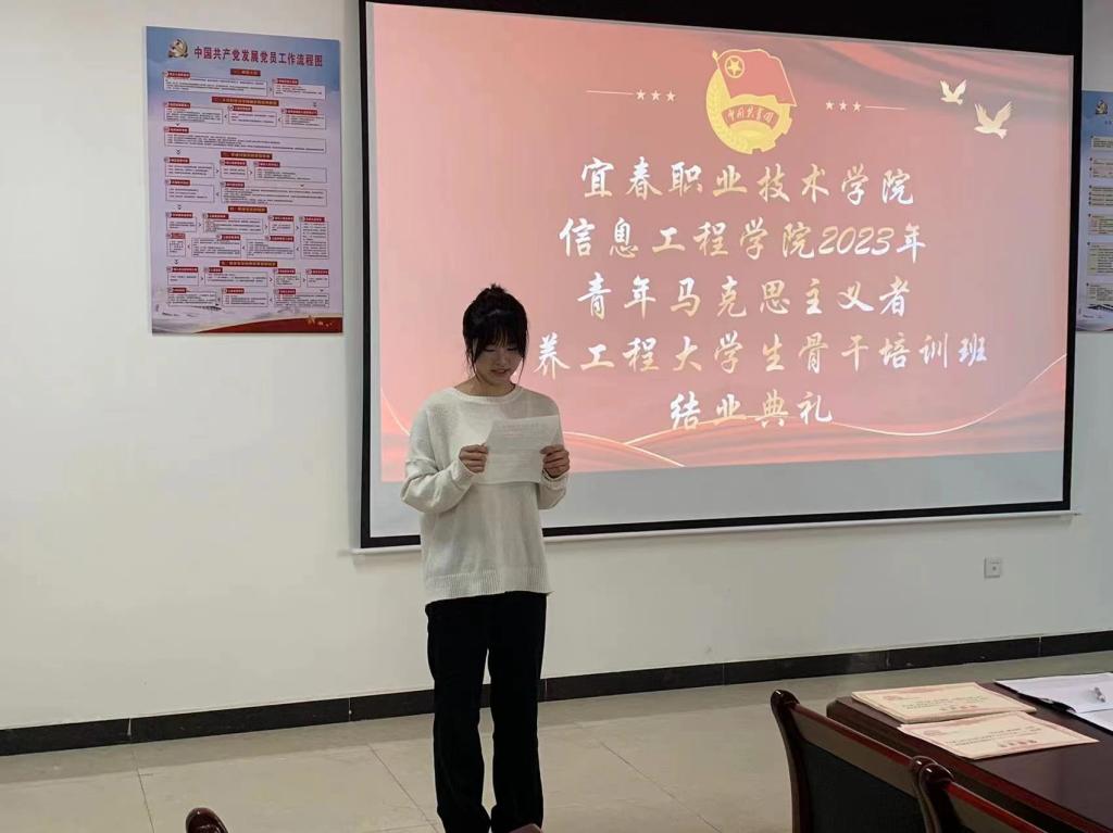 在青马班理论学习期间,简靖韡院长围绕党的二十大报告,结合学生成长共话未来畅想;陈小保副书记以音传情,让大家领悟团歌的精华;党员教师袁琦,从新时代青年推进中国式现代化的使命出发,强调责任与担当。课余,青马班同学们志愿参与校园植树等志愿服务活动。结业典礼上,优秀学员代表分享在青马班的学习感悟,通过在青马班的学习和锻炼,提高了自己的工作水平和思想觉悟,切实感受到青年的使命与担当。最后,刘嘉妮老师为本期培训中的优秀学员颁发证书,并要求大家作为“青马人”,应该严格要求自己,始终不渝的遵循马克思主义思想,坚定不移的围绕中国共产党,以青春之我、奋斗之我为新时代注入鲜活力量。
