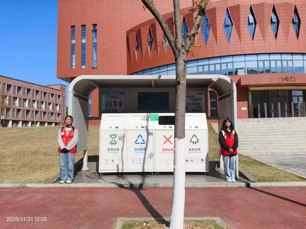 21日,志愿者来到学校各处智能垃圾箱旁,向来往的同学介绍垃圾分类知识,引导同学们树立垃圾分类的环保意识,倡导同学们积极参与到垃圾分类的行动中来,助力绿色校园建设。