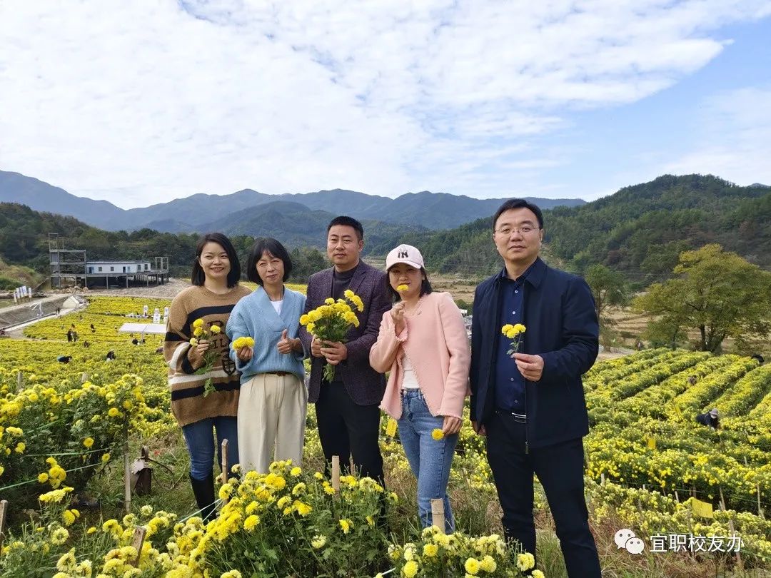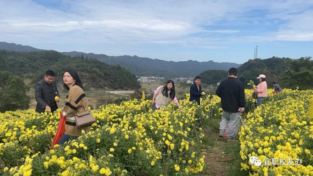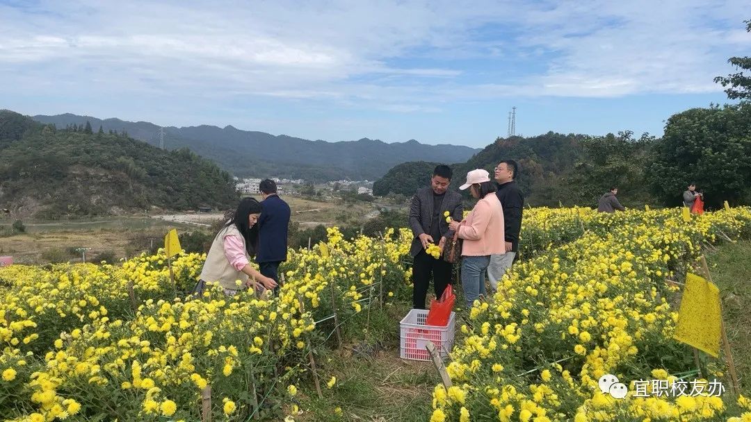 随后,大家纷纷拿起塑料袋、塑料筐上山真切的体验了一把花农的艰辛。伴随着阵阵微风,忙碌采摘的身影,欢乐的笑声,与金黄的菊花交织在一起,为种养基地增添了无限生机,校友们也收获了一篮篮丰硕的“劳动成果”。
