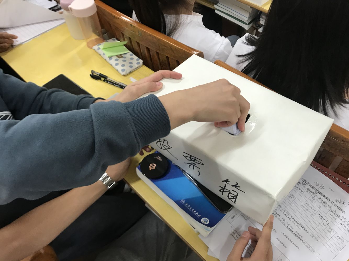 接下来,向学生代表发放选票,代表们怀揣着谨慎之心,将手中的选票投出,并由监票小组进行监票。经过严格的计票环节得出最终结果,总票数为132票,最终,李佳同学以96票、胡尹同学以95票和谢孟魁同学以94票成功入选学生会主席团!