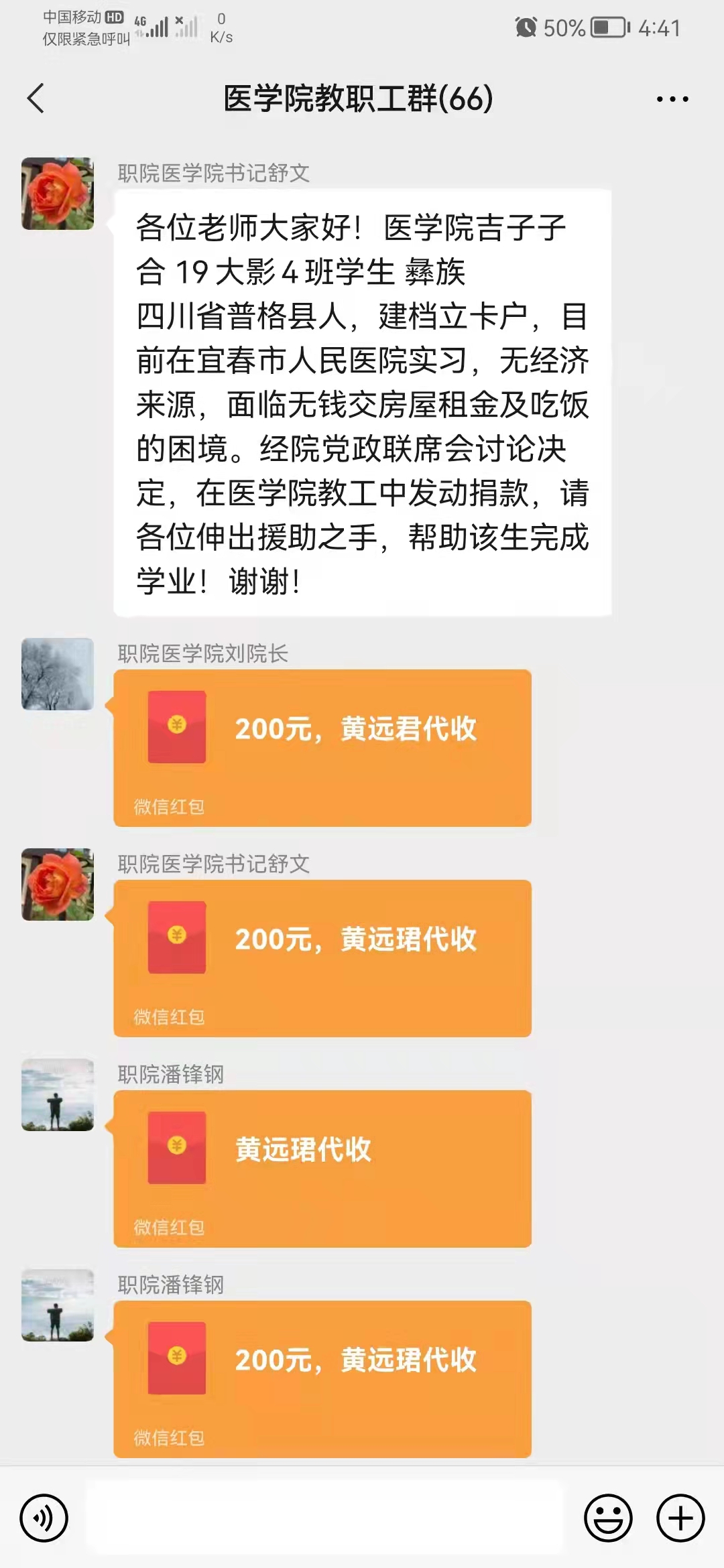 9月1日,我院了解到19大影4班同学吉子子合目前在宜春市人民医院实习,无经济来源,面临无钱交房屋租金及吃饭的困境,紧急召开学院党政联席会,并决定在我院教职工中发动捐款,一场爱心传递开始了。