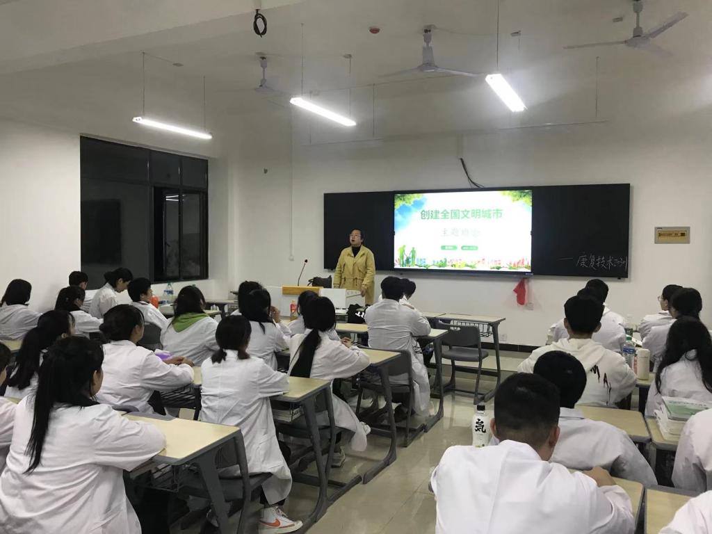 “城市,因文明而美丽;人民,因城市而骄傲。创建国家文明城市,我们既是参与者,又是受益者。为了我们美好的家园,也为了我们自身的学习生活环境,让我们立即行动起来……”。10月26日晚,医学院组织各班开展了创文明主题班会。