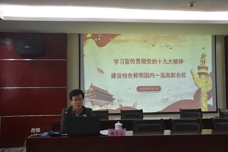这是一堂传达学习第十九次人民代表大会精神的政治必修课。以“学习贯彻党的十九大精神,建设特色鲜明、国内一流高职名校”为主题,主讲人校长杨云山以鲜明的主题,通俗的语言,生动的事例对十九大报告及相关内容进行了深入解读,推动十九大精神入耳,入脑,入心。