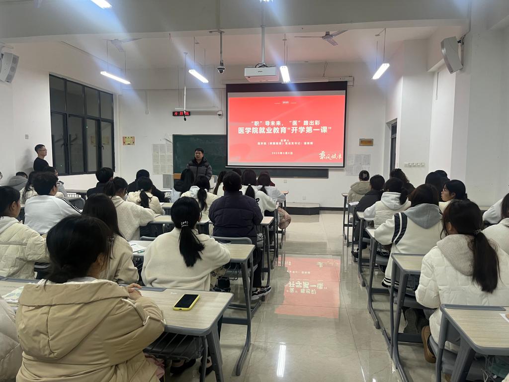3月5日晚,医学院党总支书记潘锋钢在仁济楼E311为在校学生讲授“开学就业第一课”,帮助学生更加全面了解当前就业形势,发挥就业育人实效。