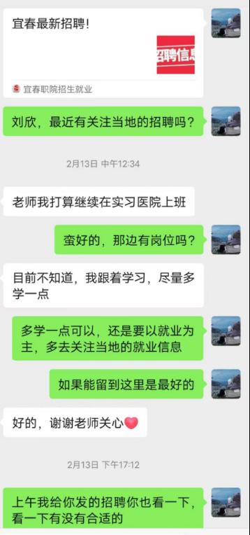 寒假期间,学院严格落实2025届毕业生重点群体100%就业,充分利用大学生就业服务平台、江西事业单位招聘网、宜职招生就业网等各级各类就业网络平台,依托学院领导、班主任、辅导员建立雨露计划就业帮扶台账工作小组,用心用情做好“一对一”结对帮扶,帮助毕业生增强就业信心,提供便利支持,尽早实现就业。同时通过家校联动、走访慰问、经济援助、岗位推荐等多种方式,精准推送就业岗位信息,实行多层次、多举措、全方位为“雨露计划”毕业生提供精准服务。