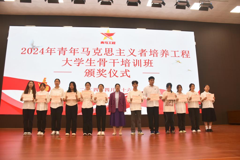 结业仪式在庄严的国歌声中拉开序幕,潘锋钢向94位顺利结业的青马班学员表示祝贺,并提出了三点要求:一是要胸怀祖国,志存高远,提升素质,锤炼品格;二是要牢记习近平总书记在庆祝中国共产主义青年团成立大会上对广大共青团员提出的五点殷切希望;三是感受实践的乐趣,体验实践的艰辛,坚持在实践中找答案、求真理,随后辅导员刘杰宣布十位优秀学员名单,优秀学员代表张小燕上台作分享,最后潘锋钢、王晔为优秀学员颁发荣誉证书,并为全体青马班成员颁发结业证书。
